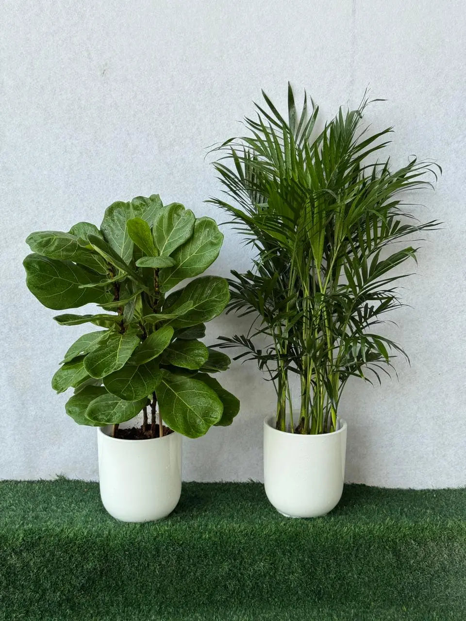 Bring lush tropical vibes to your home with our Fiddle Leaf Fig and Areca Palm duo. These elegant indoor plants in white ceramic pots add instant freshness and purify the air — perfect for living rooms, offices, or entryways.