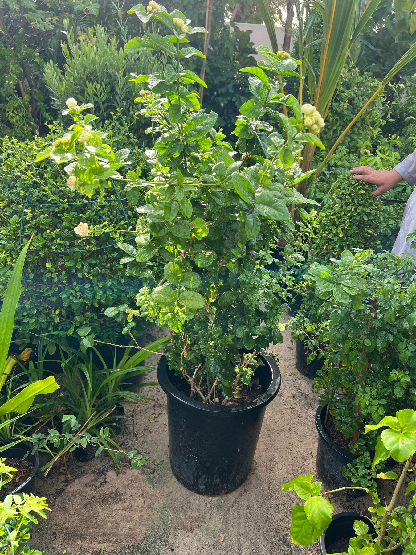 Arabian Jasmine, also known as Jasminum Sambac, is a beautiful and fragrant plant that belongs to the Oleaceae family. It is native to Southeast Asia and is widely cultivated in tropical and subtropical regions around the world. The plant is a small shrub that can grow up to 30-60cm in height and has glossy, dark green leaves that are oval-shaped and pointed at the tip. The flowers of the Arabian Jasmine are white and star-shaped, with a sweet and intoxicating fragrance that is highly prized in perfumery and aromatherapy. The Arabian Jasmine is a popular ornamental plant that is often grown in gardens, parks, and as a houseplant. It is a relatively easy plant to care for and can thrive in a variety of soil types, as long as it is well-drained. The plant prefers full sun to partial shade and requires regular watering, especially during the hot summer months. It can also benefit from occasional fertilization.