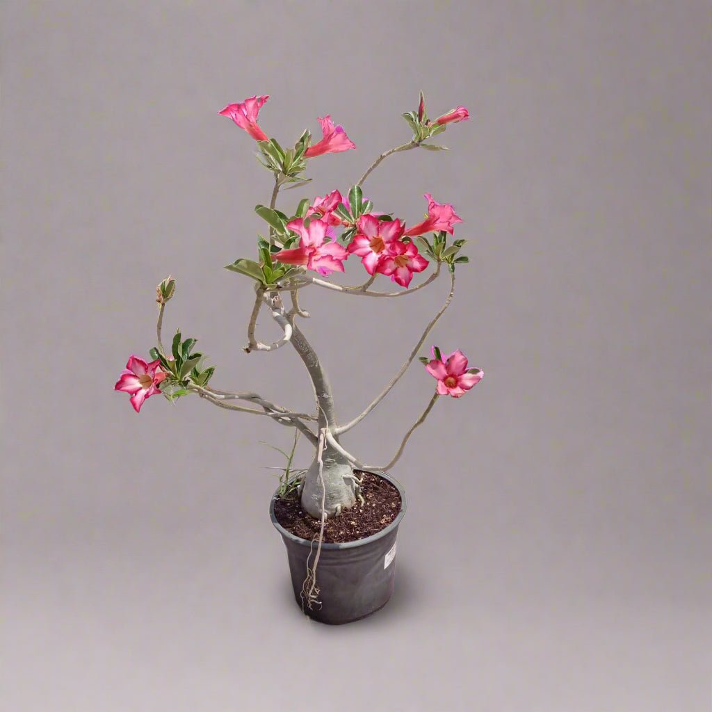 Growth Habit: Adenium Obesum is a small, deciduous shrub or succulent that typically grows up to 1-3 meters (3-10 feet) tall. Its thick, swollen base (caudex) stores water, giving the plant a unique, sculptural appearance.